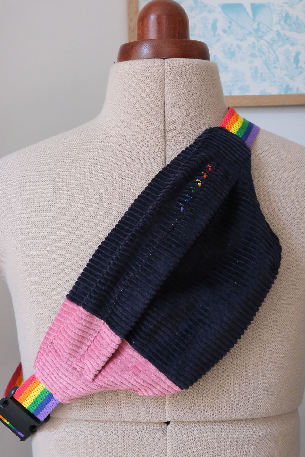 Toutes les combinaisons sont possibles : couleur du tissu, de la broderie, de la sangle