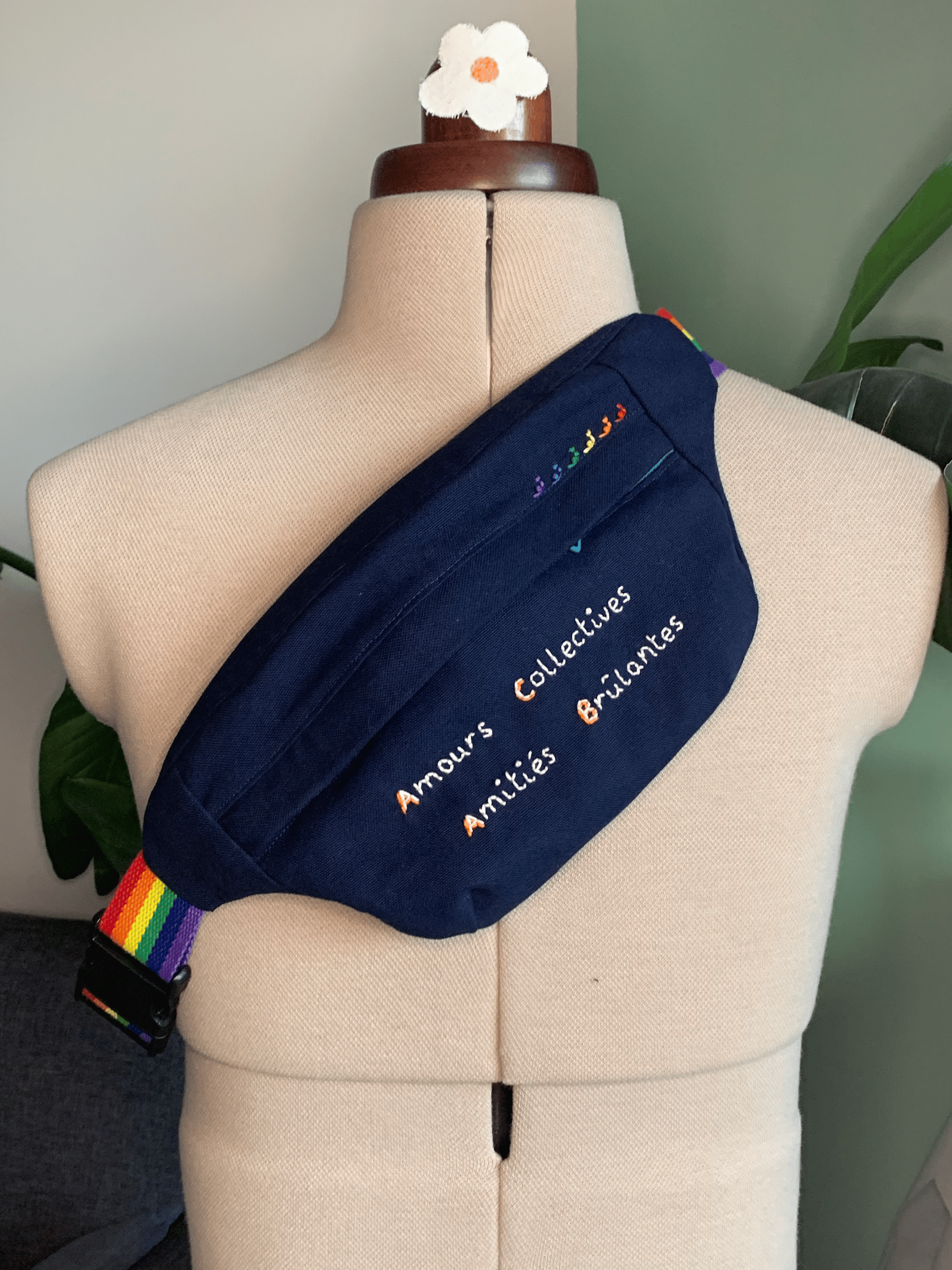 La sangle est arc-en-ciel, et des escargots brodés se baladent en file indienne (c’est mon petit signe distinctif, brodé sur chacunes de mes créations).