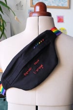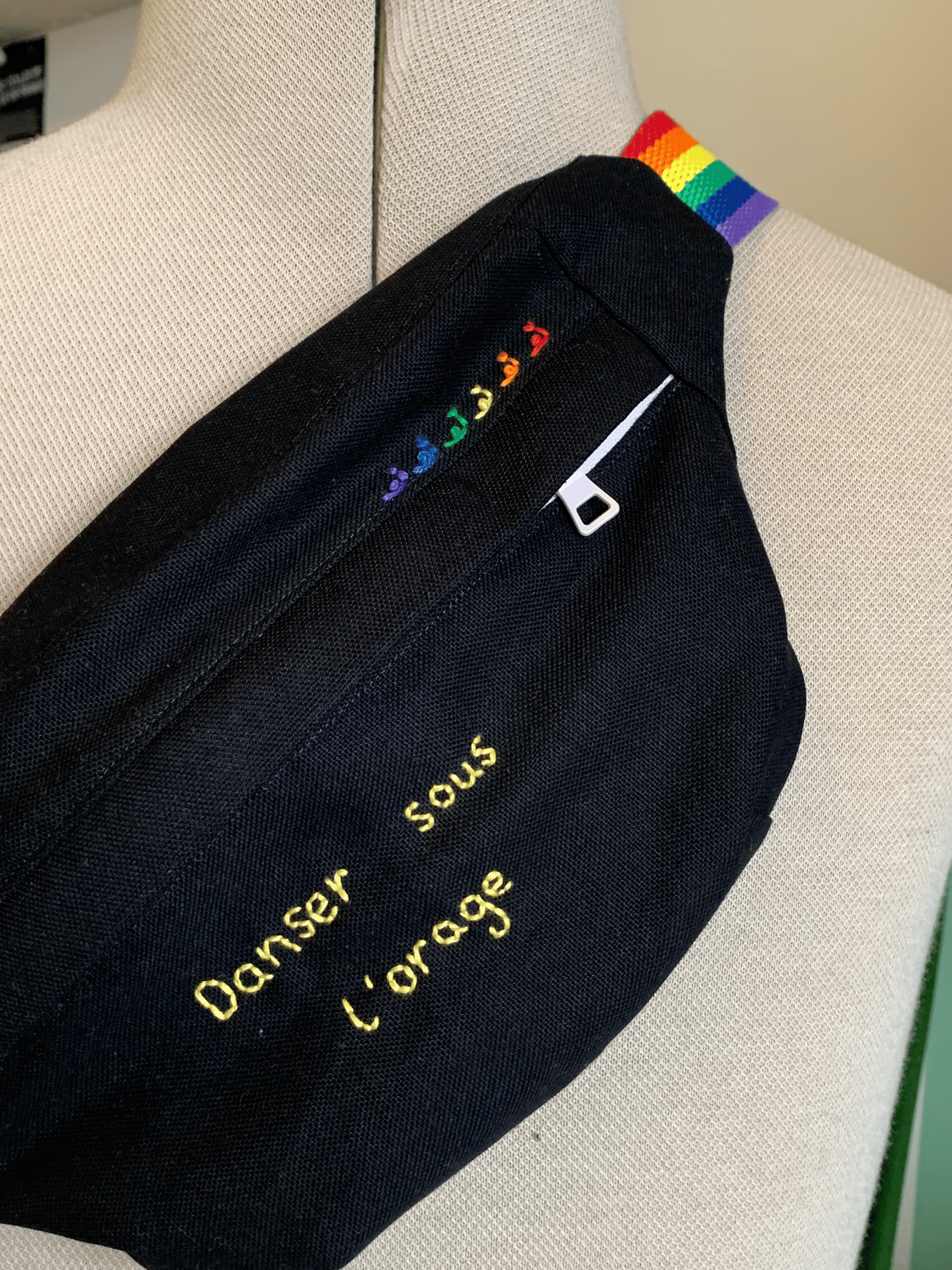La sangle est arc-en-ciel, et des escargots brodés se baladent en file indienne (c’est mon petit signe distinctif, brodé sur chacunes de mes créations).