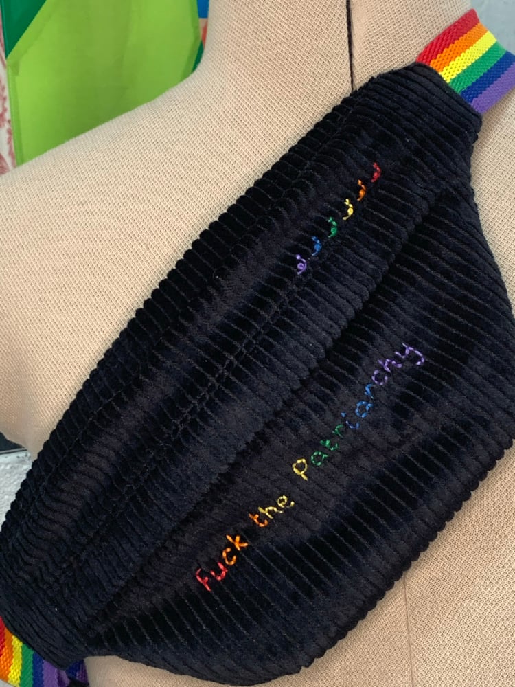 La sangle est arc-en-ciel, et des escargots brodés se baladent en file indienne (c’est mon petit signe distinctif, brodé sur chacunes de mes créations).