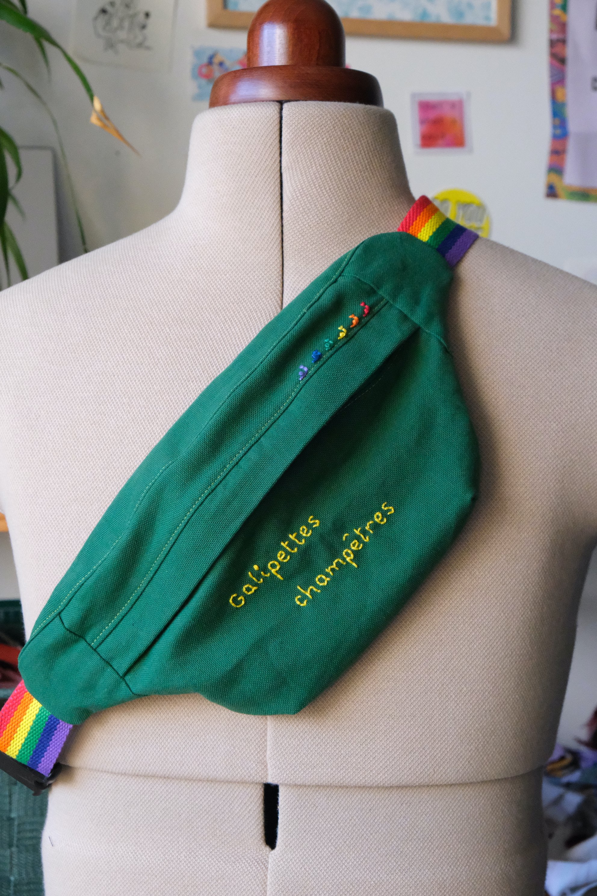 La sangle est arc-en-ciel, et des escargots brodés se baladent en file indienne (c’est mon petit signe distinctif, brodé sur chacunes de mes créations).