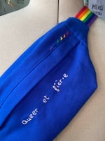 La sangle est arc-en-ciel, et des escargots brodés se baladent en file indienne (c’est mon petit signe distinctif, brodé sur chacunes de mes créations).