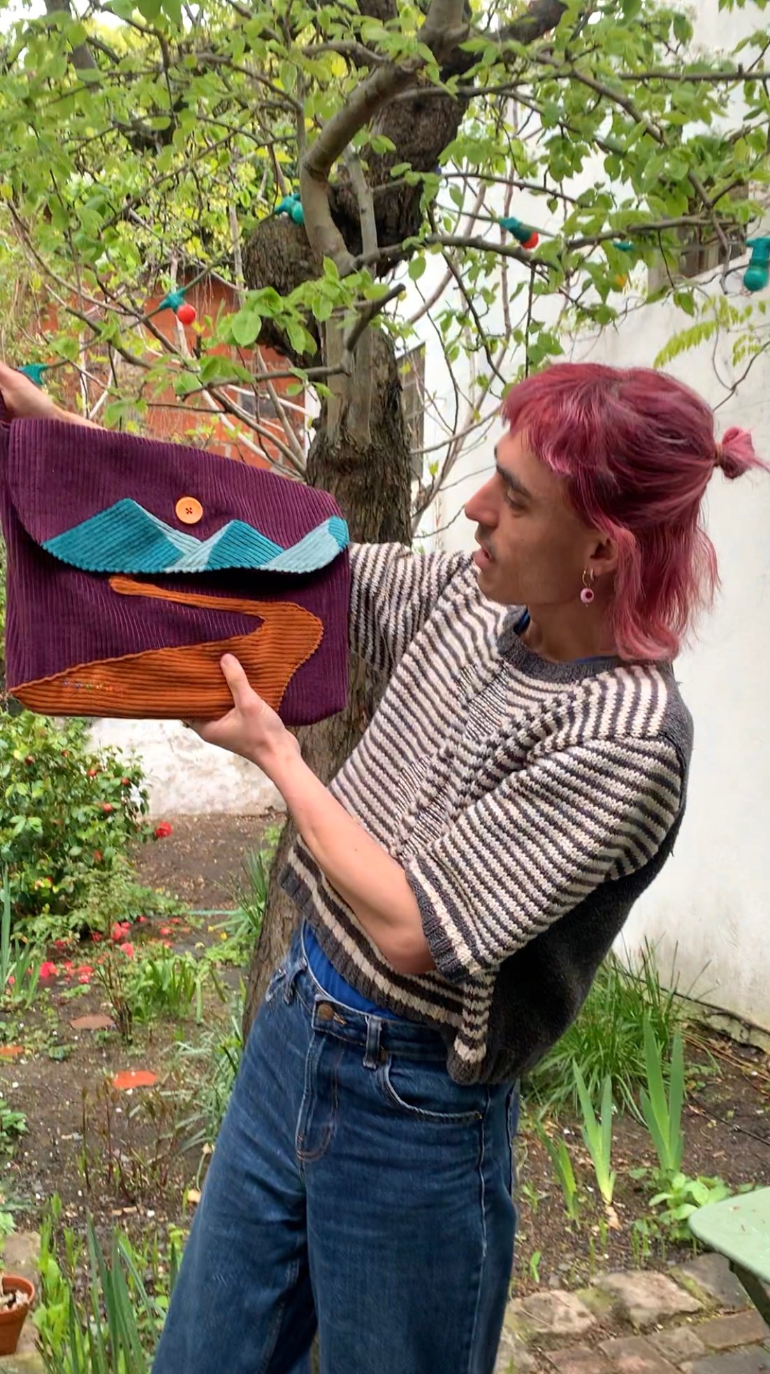 Sac bandoulière paysage, en velours côtelé et doublé en coton avec deux poches intérieures. Mousqueton et boucle réglable pour la longueur de la sangle. Des escargots brodés se baladent sur l'avant de la pochette.
