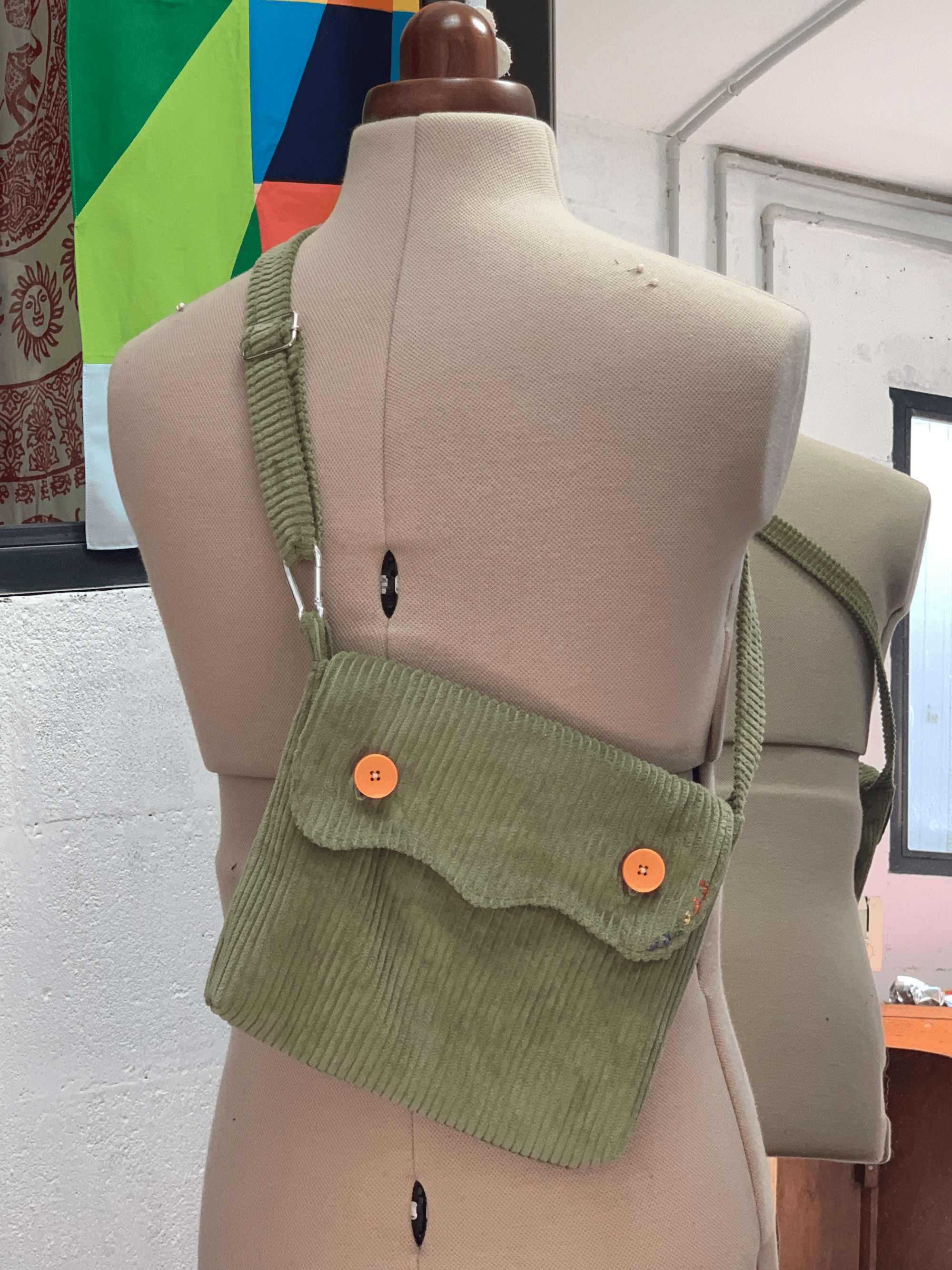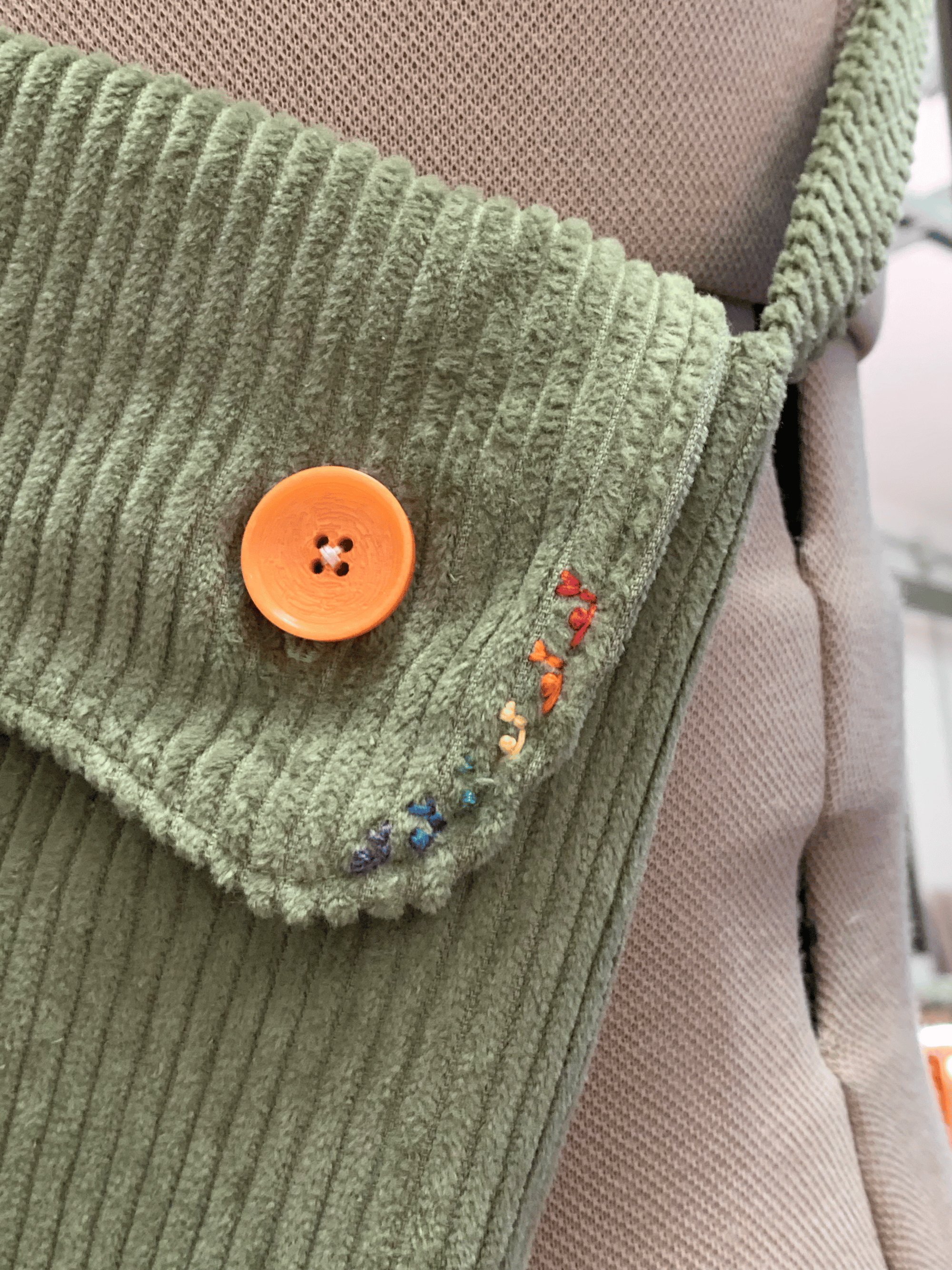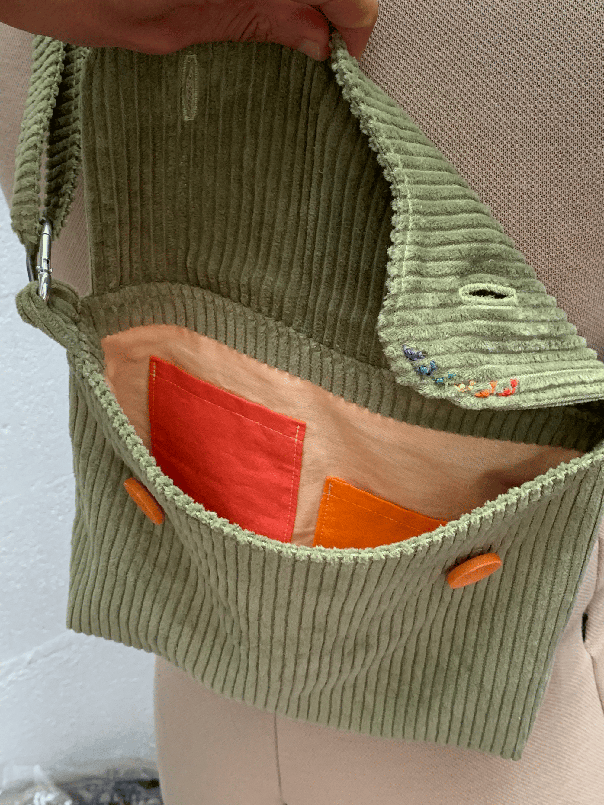 Sac bandoulière au format A5, en velours côtelé et doublé en coton avec deux poches intérieures. Mousqueton et boucle réglable pour la longueur de la sangle. Des escargots brodés se baladent sur l'avant de la pochette.