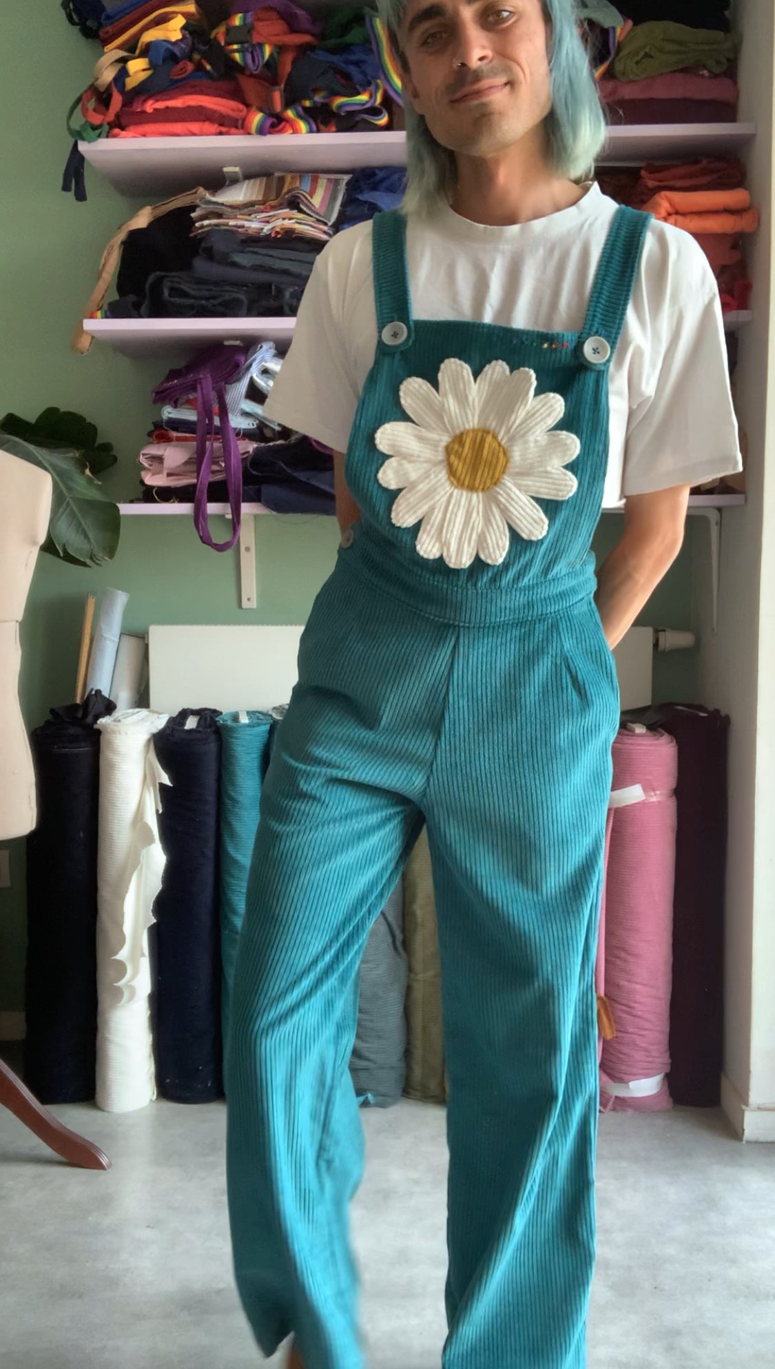 Salopette en velours côtelé avec une poche marguerite. Le choix des couleurs peut être différent que celles sur la photo. Nous pouvons voir ensemble pour des tests de couleurs à accorder.
