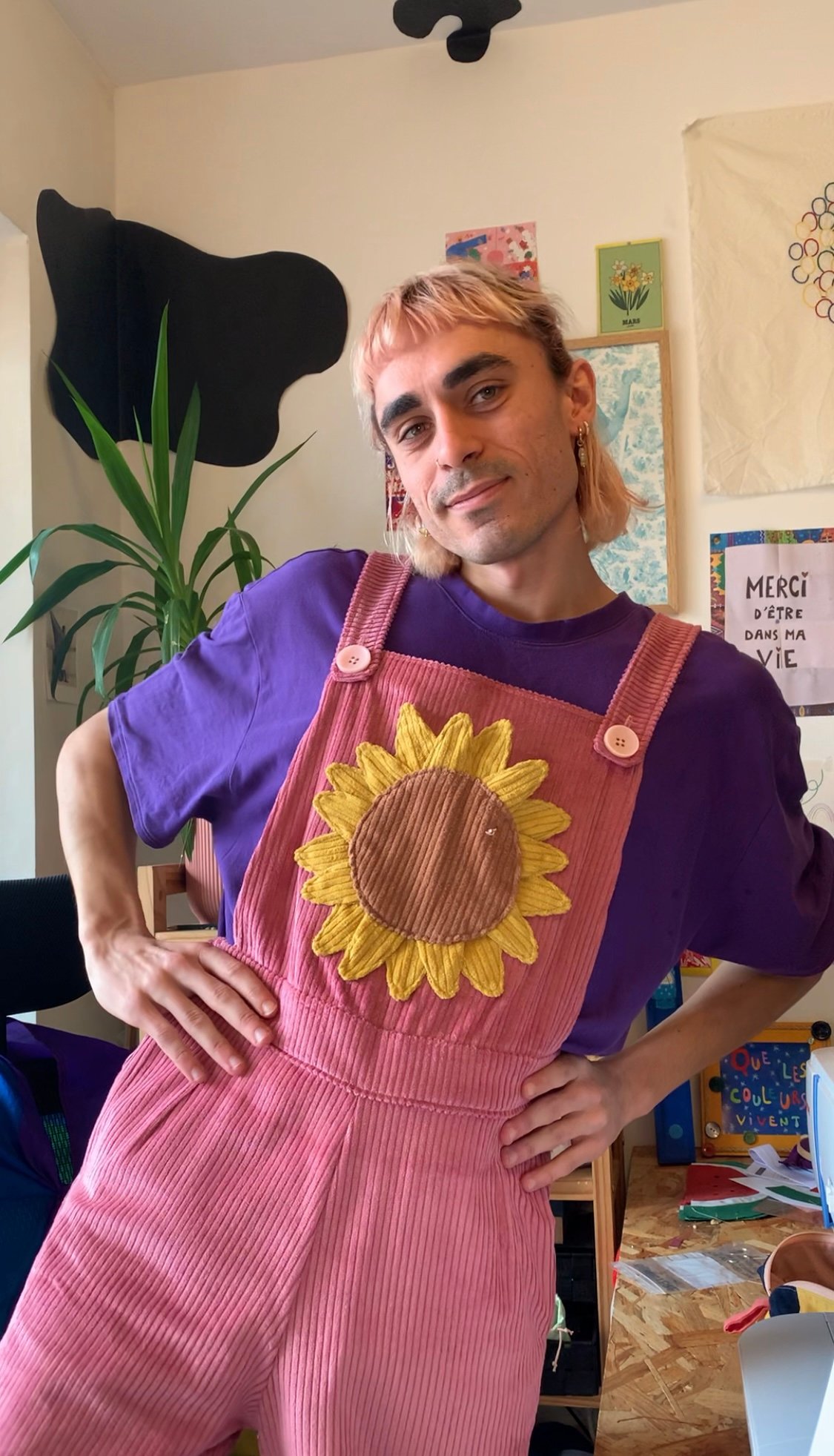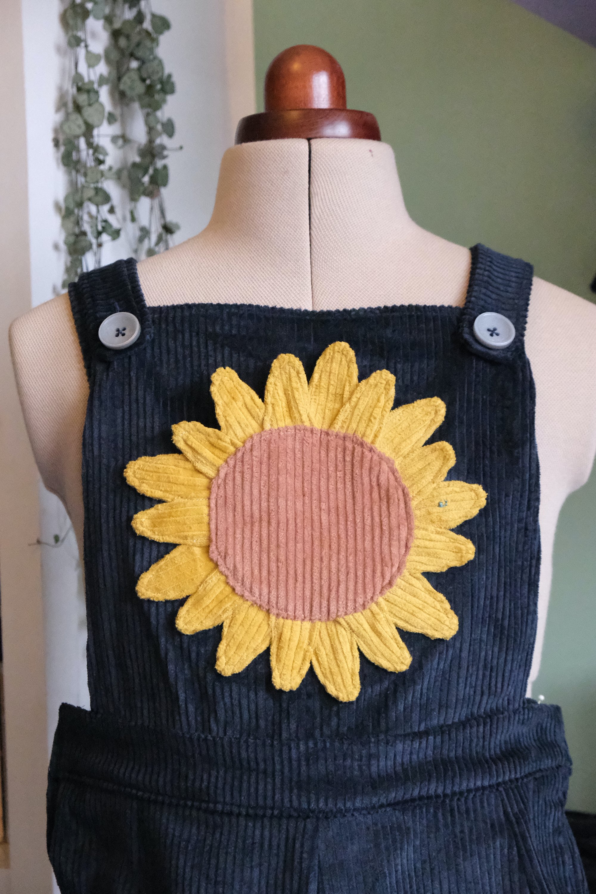 Salopette en velours côtelé avec une poche tournesol. Le choix des couleurs peut être différent que celles sur la photo. Nous pouvons voir ensemble pour des tests de couleurs à accorder.